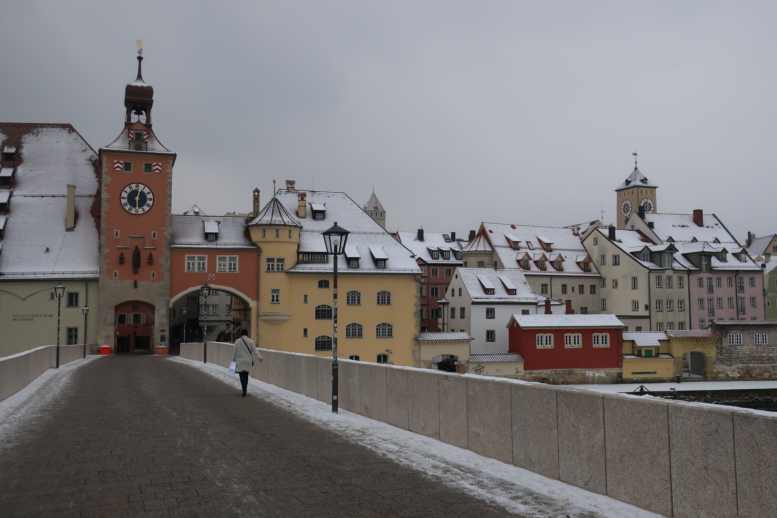 Regensburg--Winter 2019--Danube River with 16 arch stone bridge built in 1146--Gate to bridge with St. Peter Dom