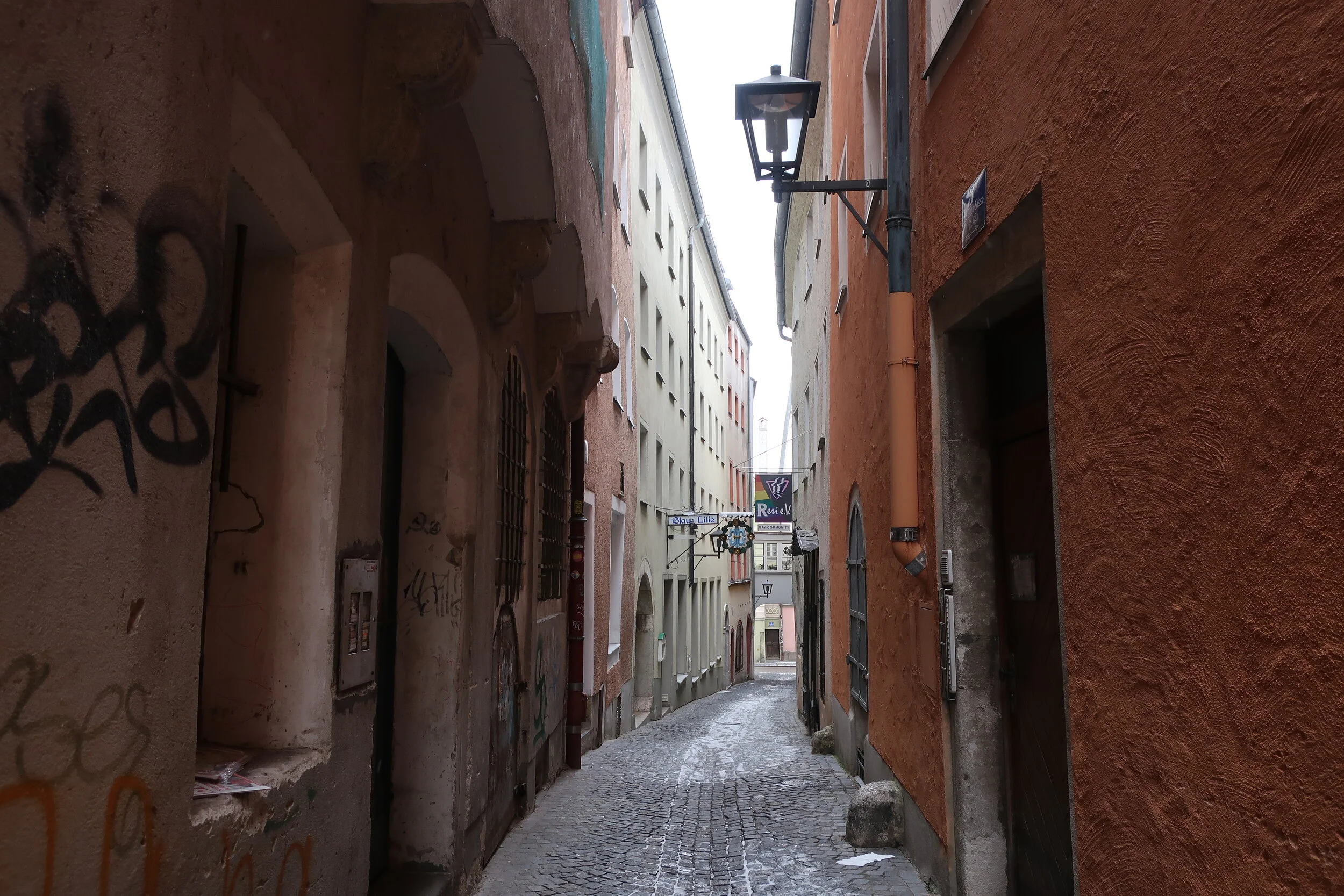 Regensburg--Winter 2019--Typical narrow street with Dom in back